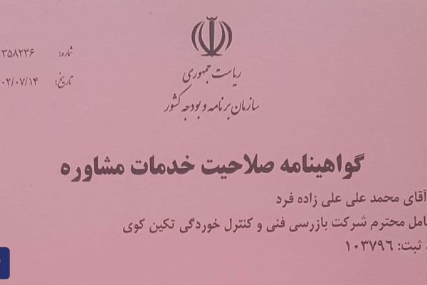 دریافت گواهینامه صلاحیت رتبه یک خدمات مشاوره در زمینه بازرسی فنی و تاسیسات برق مکانیک توسط شرکت تکینکو